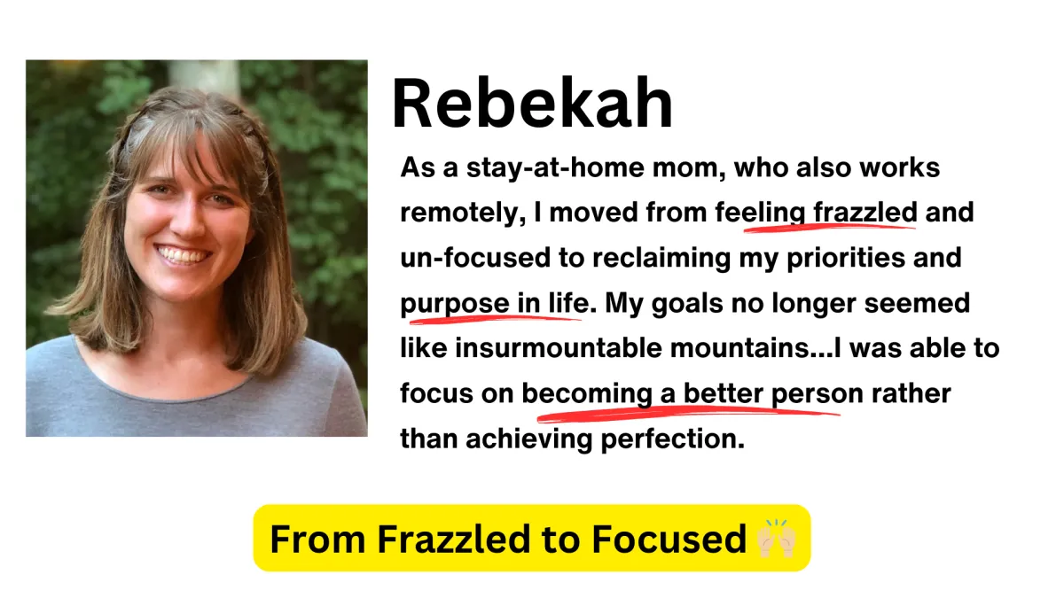 ✅ A stay-at-home mom went from feeling frazzled and unfocused to reclaiming her priorities and purpose—breaking her progress into manageable steps.